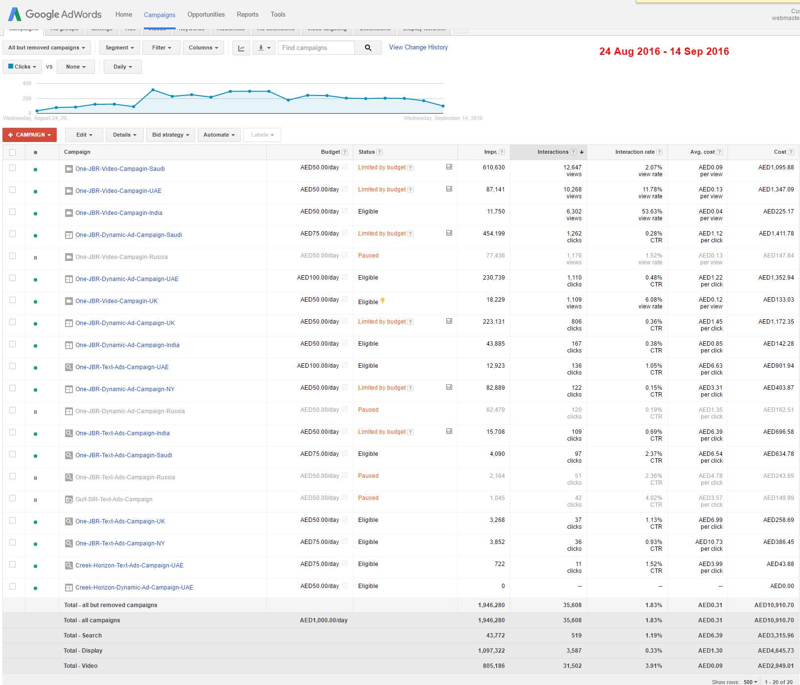 The strategy was to setup the most efficient Omni Channel campaigns in Google AdWords network to achieve the goals. The targeting was comprised of ads on GDN with specific targeted countries and cities. Setup covered almost 17 campaigns for 1/JBR in 5 different countries targeting 3 different languages (English, Russian, and Arabic) in google display networks which is below: